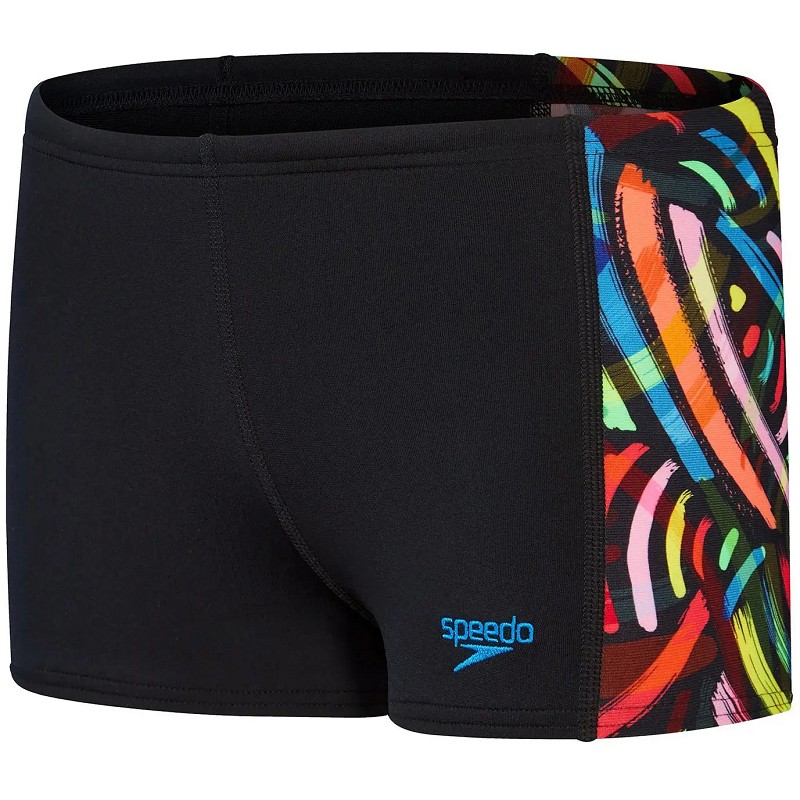Met zijn strakke zwarte design en opvallende zijpanelen met een kleurrijk 'brushstrokes'-patroon, ziet deze aquashort er fantastisch uit. De voorkant van de zwembroek is gevoerd voor extra comfort en discretie. Bovendien bevat de zwembroek een interne trekkoord waarmee je de pasvorm kunt aanpassen voor een perfecte, veilige pasvorm.